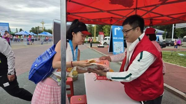 比赛当日,“福彩红”成为赛道上最亮眼的风景线之一。 大家早早驻守各服务点,手脚麻利地为途经选手递上饮用水、湿巾与纸巾——清凉的饮用水缓解奔跑口渴,柔软的湿巾擦去额头汗水,实用的纸巾应对突发需求,每一份物资都承载着细致关怀。红色马甲穿梭在人群中,志愿者们的微笑与加油声,成为选手们突破极限、向终点冲刺的暖心动力。